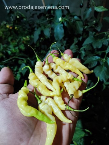 Murupi Amarela, brazilska lepotica iz Amazona, pleni svojim naboranim kremasto belim plodovima.Ovi plodovi su u početku svetlozelene, sazrevaju u zadivljujuću kremasto belu nijansu, ukrašavajući biljku koja naraste do 60 cm u visinu. Sa svojim upečatljivim izgledom i fantastičnom produktivnošću, Murupi Amarela je tražena sorta čilija izuzetno hrskave teksture i slatkog ukusa limuna citrusa.Njena snažna toplota čini je idealnimom za one koji cene začinjenu kulinarsku avanturu. Ona se kreće oko 100.000 SHU na Skovilovoj skali.