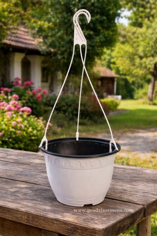 Ova viseća saksija je idealna za sve vrste cveća narocito za cvce koje pada u slapovima ili lozice . Napravljena je od prilicno fleksibilne plastike debljine oko 0,5–0,6 mm, sa ojačanim rubovima oko zakačke i blago reljefnim šarama spolja što joj daje dekorativan izgled i dodatnu čvrstoću.