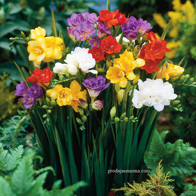 Mešavina frezije ima iste šarene i mirisne kvalitete kao pojedinačna frezija, ali sa duplim laticama, stvarajući živahne naborane cvetove visine 30-45 cm sa divnim slatkim mirisom. Idealne su za sadnju u ivici ili u saksijama i kontejnerima, gde god je najbolje uživati u mirisu i lepoti. Za duže letnje izlaganje sadite u intervalima od 7-10 dana. Prelepo nabrano cveće čini odlično rezano cveće za vazu i omiljeno je među cvećarama.Cveta od juna do septembra.