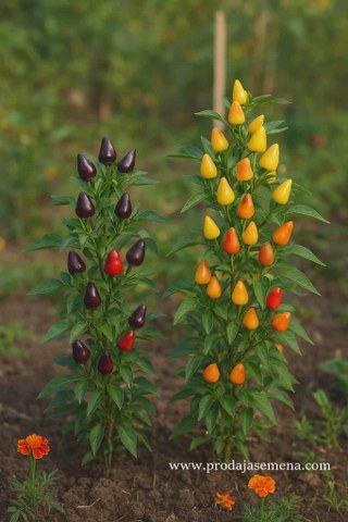 Sitni, dekorativni plodovi dužine 2–4 cm, kupastog oblika sa blago zaobljenim vrhom. Na jednoj biljci može se naći čitav miks boja – od mlečno bele, preko svetložute sa ljubičastim vrhom, pa do narandžaste i jarko crvene. Druga varijanta nosi plodove svetloljubičaste i crvene boje, pravi vizuelni dragulj u svakoj bašti ili saksiji!