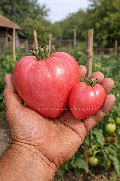 Prava domaća sorta, gajena prirodno (bez posebne nege) – samo voda, vazduh i kopriva. Plodovi teže 150–300 g, ponekad i do 500–600 g, sa čvrstim, zbijenim mesom. Sočni i sladunjavi, sa blagom, prirodnom kiselinom, sa malo semenki u plodu. Nežna pink boja, biljke snažne, sa obiljem plodova, rastu do 2 m, obavezna potpora.