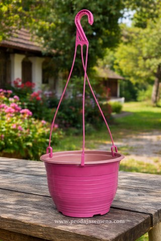 Ova viseća saksija je idealna za sve vrste cveća narocito za cvece koje pada u slapovima ili lozice . Napravljena je od prilicno fleksibilne plastike debljine oko 0,5–0,6 mm, sa ojačanim rubovima oko zakačke i blago reljefnim šarama spolja što joj daje dekorativan izgled i dodatnu čvrstoću.